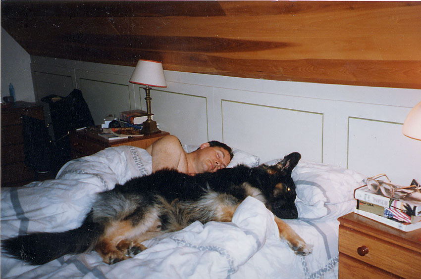 The dog likes sleeping on the bed. When Mum gets up to go to the bathroom, she has to clear him off upon her return.