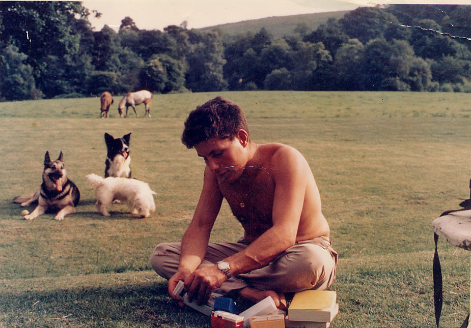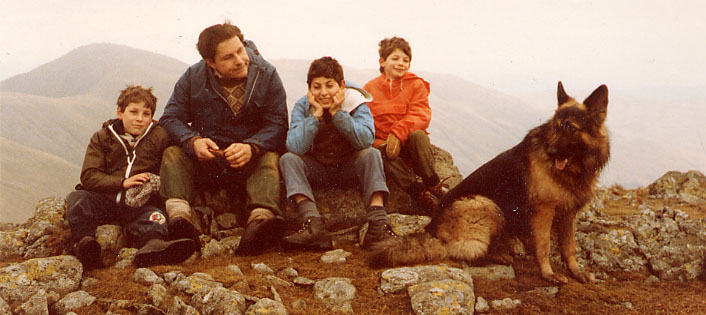 On top of a mountain, Mike, Dad, me, Hugh and Dog watch the clouds roll in.